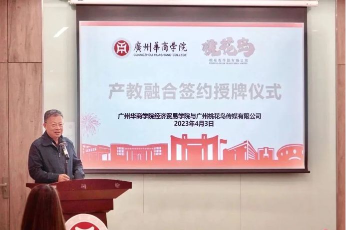 为进一步深化产教融合改革,促进校企合作取得新成果,4月3日下午,广州华商学院经济贸易学院(下称:经济贸易学院)于与广州桃花岛传媒有限公司(下称:桃花岛)在我校图书馆教师发展中心互动室5举行了产教融合框架协议签约暨授牌仪式。