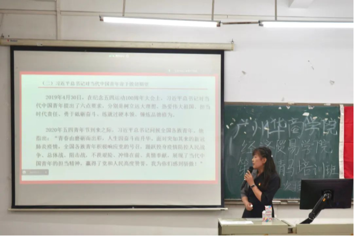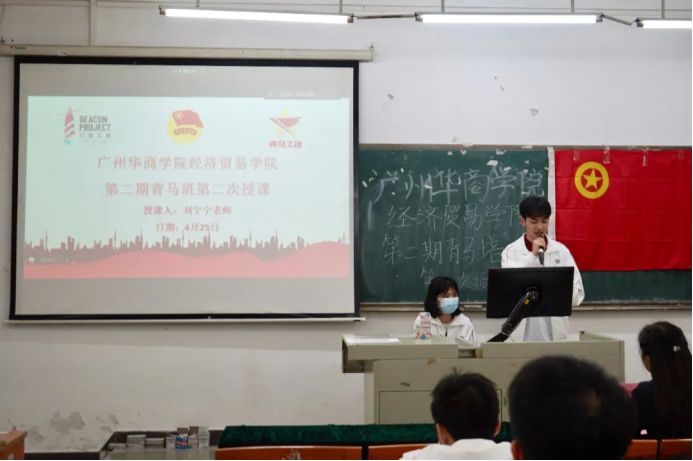 奋斗新时代,青春正当时,为增强青年学员们的责任意识与担当,促使青年学员们奋发践行“请党放心,强国有我”的青春誓言,在实现中华民族伟大复兴中国梦的新征程上勇往直前,经济贸易学院于2023年4月25日18时45分在增城校区励志楼C305和四会校区8号楼402,同时开展了广州华商学院经济贸易学院青马班第二次授课,并有幸邀请到经济贸易学院教工党支部副书记刘宁宁老师为本次授课。