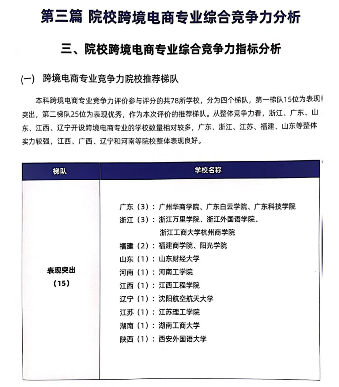目前,全国开设跨境电子商务专业的本科高校共78所,开设该专业的高职院校有300余所,覆盖28个省市自治区。其中,广东省开设跨境电子商务专业有本科高校7所和高职院校42所。经综合评价,参与本科跨境电商专业竞争力评分的78所高校,根据评分划分为四个梯队,第一梯队15所高校为表现突出,第二梯队25所高校为表现优秀,作为本次评价的推荐梯队。广东省跨境电子商务专业表现突出的本科院校共3所,广州华商学院经济贸易学院的跨境电子商务专业荣登榜单,因专业竞争力表现突出,进入第一梯队!