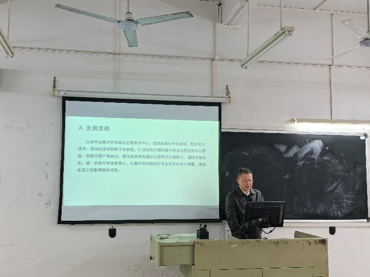 在谈到办学定位和特色凝练时,李院长指出,学院要以数字化转型、国际化办学和产教融合为办学载体,逐步凝练出学院的办学特色。他提出,学院应建设成面向数字经济产业与数字贸易领域的数字经济与贸易学院,并建议在条件成熟后报学校申请更名为“数字经贸学院”。