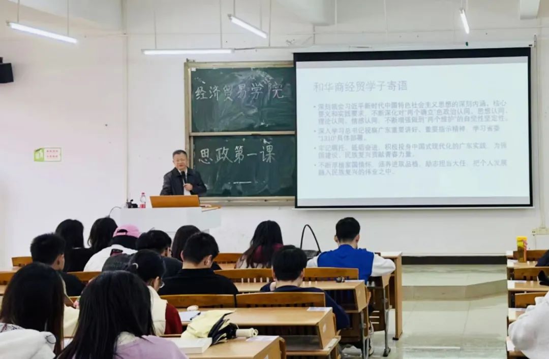 为深入学习贯彻习近平新时代中国特色社会主义思想,增进广大青年学生对党的创新理论的政治认同、思想认同、理论认同、情感认同,铸牢听党话、跟党走的思想根基,进一步引导学生将个人命运前途与实现中华民族伟大复兴的伟大征程紧密结合,广州华商学院经济贸易学院开展新学期思政第一课。