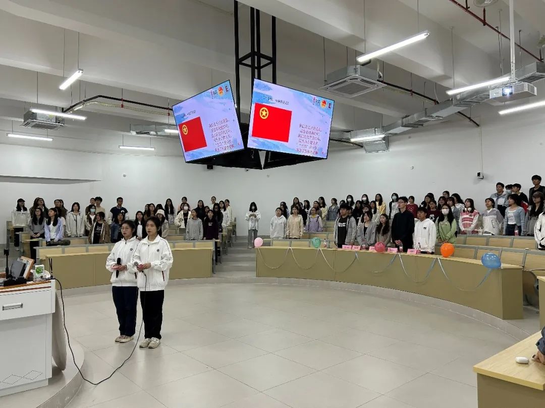 全体起立,面向团旗,奏唱团歌。