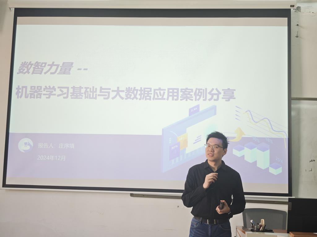 2024年12月4日上午,经我校专创融合课程《统计学专业综合实验课》课程组邀请,我校数字经贸学院经济统计系“数智化统计应用型人才产科教融合实践教学基地”企业导师庄序填老师走进《统计学专业综合实验课》课堂,在创新楼E506为21级两个经济统计学班的同学们带来了一场主题为“数智力量——机器学习基础与大数据应用案例分享”的精彩授课,本次课堂由课程教师石立副教授主持,经济统计系金莹、刘承主、张娟娟、齐志超等老师共同出席了本次企业导师进课堂活动。