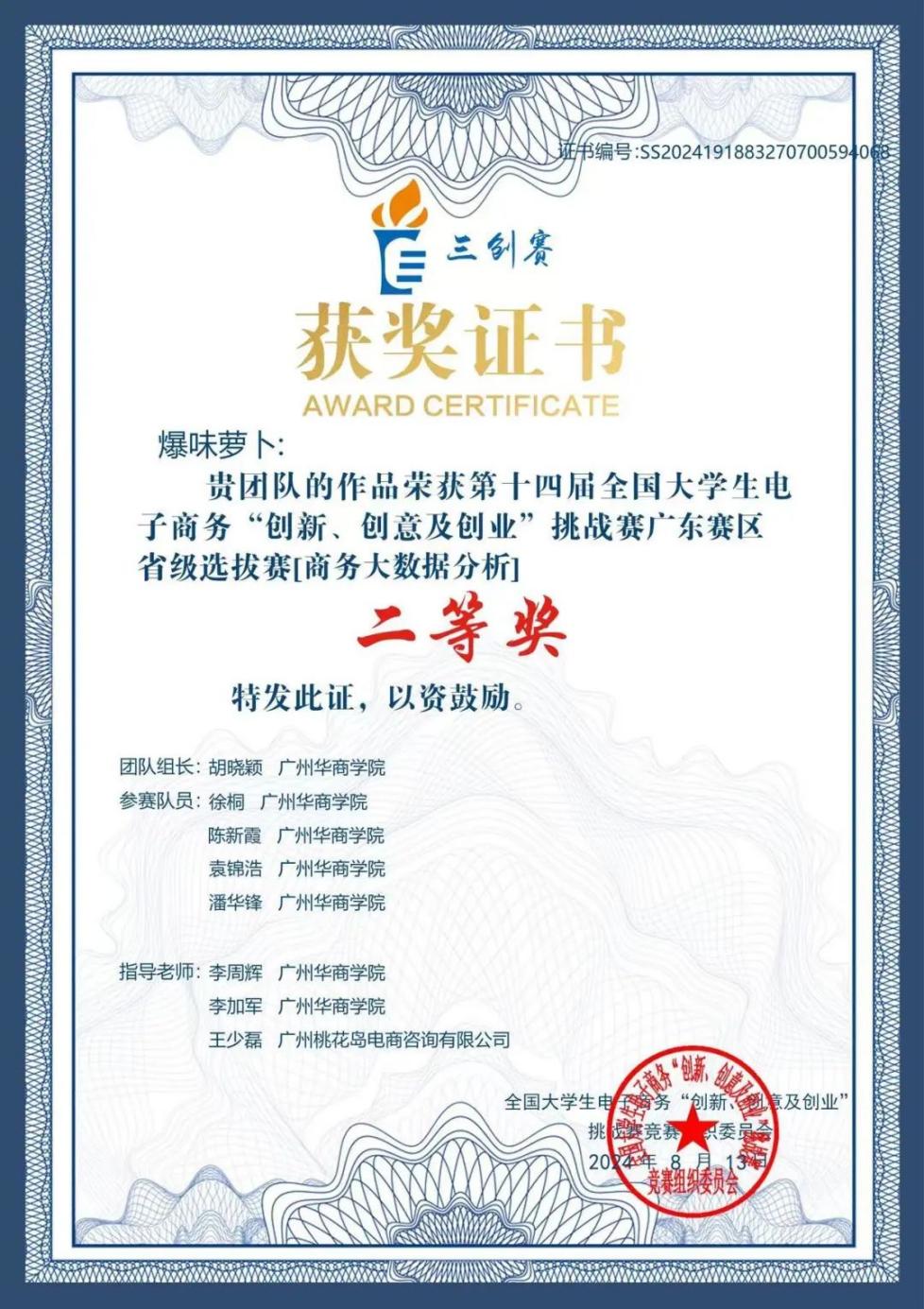 2.6月29日,第十四届全国大学生电子商务“创新、创意及创业”挑战赛(简称“三创赛”)广东省选拔赛在广州工商学院落下帷幕。经过激烈的角逐,最终广州华商学院“爆味萝卜”队凭借项目《IAA国际香氛生活电器店铺数据分析报告》,荣获三创赛省级二等奖,为学校争光添彩。