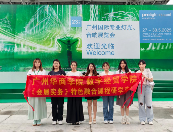 第23届广州国际专业灯光、音响展览会于2025年5月27-30日在中国进出口商品交易会展馆A、B、D区盛大举行。本届展期正值广州华商学院数字经贸学院“会展实务”课程开展期间。基于LEAP教学模式,在课堂讲授会展理论知识之余,为进一步鼓励学生深入展会现场、践行所学技能,由课程组负责人周敏仪老师再次带领华商数字经贸学子进驻广州灯光音响展实习,为恩平市迈声斯音响设备有限公司等多家外贸参展企业提供外语翻译沟通服务。本次参与展会实习的共有8位同学,她们是国际经济与贸易、跨境电子商务专业大二、大三的同学。