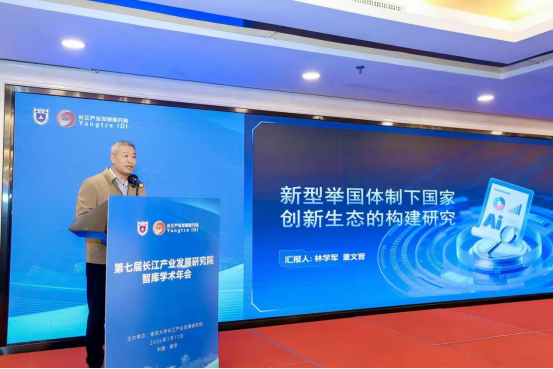 2026年1月17日,备受行业关注的第七届长江产业发展研究院智库学术年会在南京隆重召开。本次会议由南京大学长江产业发展研究院牵头,汇聚了国内众多领域内的顶尖专家、学者及行业精英,围绕“十五五高质量发展主线,巩固壮大实体经济根基”这一主题,展开深入研讨与交流,为中国特色新型智库建设注入新动能、贡献新力量。会议由南京大学原党委常务副书记、长江产业发展研究院执行院长杨忠教授,长江产业发展研究院副院长江静教授、陈柳研究员共同主持。数字经贸学院林学军教授、董文晋老师应邀参会,与学界同仁共飨学术盛宴,共享前沿成果。