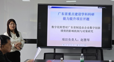 作为科研团队重要成员的赵慧琴老师首先登台,对二类科研团队项目进行开题汇报。该课题立足国家“数字中国”战略,系统探讨数字化转型如何影响制造业企业的数字创新绩效,旨在揭示内在影响机制,并提出具有可操作性的对策建议。课题组成员前期科研成果丰富,课题成果预期将为广东省乃至全国制造业数字化转型提供理论支撑与实践指导。