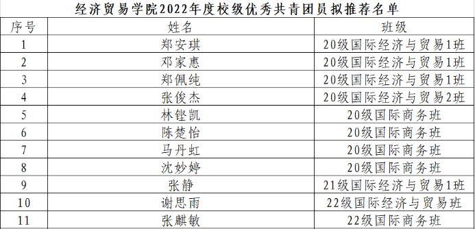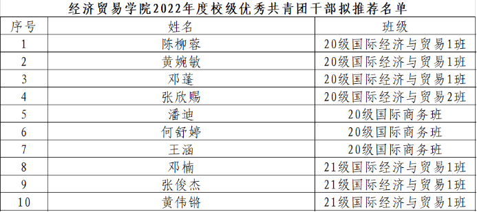 经学生自荐参评,我院资格审查,讨论评审,秉持公平、公正、公开的原则,现拟推荐20级国际经济与贸易1班团支部为经济贸易学院2022年度校级优秀团支部拟推荐支部;陈柳蓉等10人为经济贸易学院2022年度校级优秀共青团干部拟推荐者;陈柳蓉、黄婉敏2人为经济贸易学院2022年度校级十佳优秀共青团干部拟推荐者;郑安琪等11人为经济贸易学院2022年度校级优秀共青团员拟推荐者;郑安琪、林铿凯2人为经济贸易学院2022年度校级十佳优秀共青团员拟推荐者。现将拟推荐名单予以公示(以下排名不分先后):