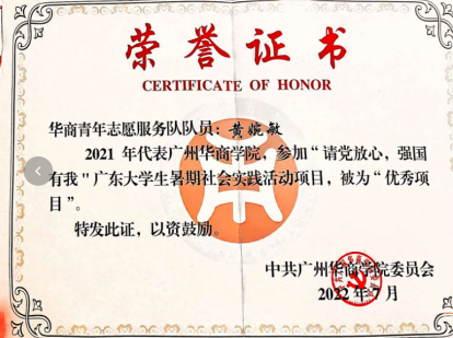 2021 年代表广州华商学院,参加“请党放心,强国有我"广东大学生暑期社会实践活动项目,被为“优秀项目”。