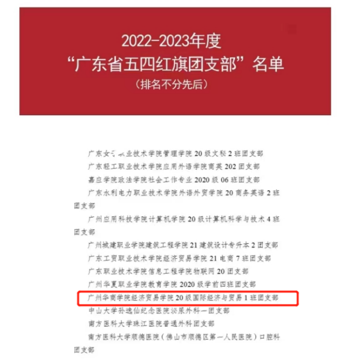 此次荣获广东省“五四红旗团支部”,对于经济贸易学院团委与20级国际经济与贸易1班团支部来说是一种激励也是一种肯定。经济贸易学院团委将继续高举习近平新时代中国特色社会主义思想,在党的二十大精神指导下,以党建带领团建,永不懈怠、踔厉奋斗,紧紧围绕立德树人根本任务,认真履行引领凝聚青年、组织动员青年、联系服务青年的职责,坚持用党的科学理论武装青年、用党的初心使命感召青年,切实保持和增强共青团组织的政治性、先进性、群众性,不断提升共青团组织的引领力、服务力和大局贡献度,为党组织培养输送更多堪当时代大任的青年人才。