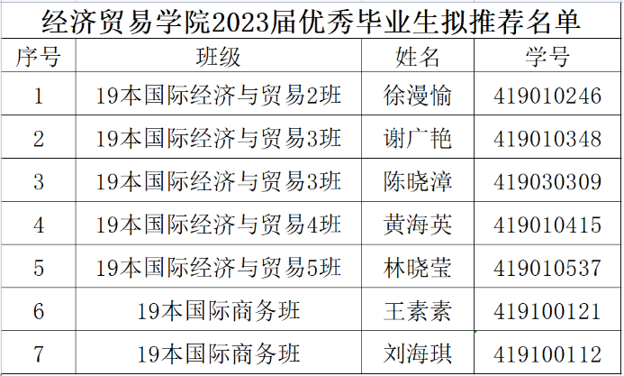 为落实立德树人根本任务,树立先进典型,凝聚榜样力量,充分发挥我校优秀毕业生的示范激励引领作用,培养德、智、体、美、劳全面发展的新时代人才。据学校《关于评选2023届优秀毕业生的通知》、《广州华商学院优秀毕业生评选奖励办法》等文件精神,经学生自主申请,学院评审,拟推荐19本国际经济与贸易2班徐漫愉等7名同学为广州华商学院2023届优秀毕业生。现对经济贸易学院2023届优秀毕业生拟推荐名单进行公示,名单如下: