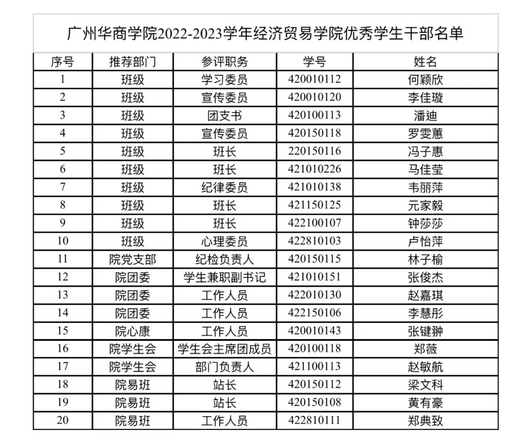 根据广州华商学院《关于做好2022-2023学年优秀学生干部评选工作的通知》文件内容,经济贸易学院本着“公开、公正、公平、择优”的原则,认真组织2022-2023学年评选工作。经学生自主申请,班级评议、辅导员评审,我院决定拟推荐何颖欣等20名同学为优秀学生干部。