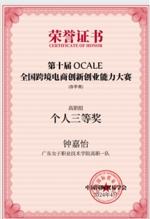 三年专科时光,是厚积薄发的成长历程。作为广东女子职业技术学院跨境电商专业的学生,钟嘉怡始终秉持“勤学善思、笃行实干”的态度,在专业学习中精益求精。课堂上专注钻研理论知识,课后主动拓展实践技能,不仅连续斩获学校“学业优秀奖”“能力优秀奖”,更以优异的综合表现获评 学校“优秀毕业生”,成为同学们眼中的“全能榜样”。