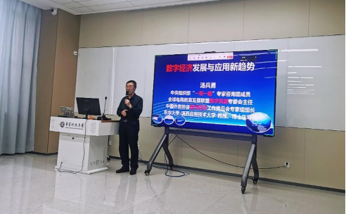 为把握数字经济时代背景下专业建设和人才培养的新动态,深化产教融合创新实践,数字经贸学院于2025年4月7日下午在弘美楼310举办了"数字经济发展与应用新趋势"专题讲座,本次讲座特邀汤兵勇教授担任主讲嘉宾。参加本次讲座的有数字经贸学院院长李广明教授、副院长李伟教授、院长助理赵慧琴副教授、马林教授、姚顺波教授、韩丽姝教授、数字经贸学院各系教师代表及学生代表共80余人到场聆听,讲座由数字经济系副主任彭珍老师主持。