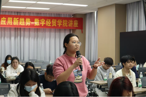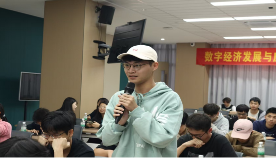 汤教授的主题演讲结束后,学生们紧抓与教授交流机会,争先恐后举手提问。有学生提问:随着数字经济的发展,传统的商业模式面临着哪些挑战和机遇,企业应该如何进行商业模式创新以适应新的市场环境。也有学生问到在制造业、农业、服务业等不同行业中,数字经济的应用呈现出哪些新的趋势和特点。