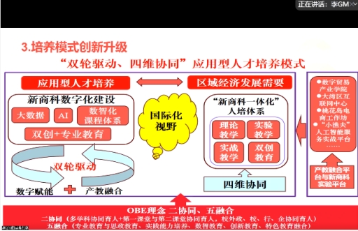 会上,李广明院长详细介绍了当前学院人才培养方案的修订进展。他指出,2025年人才培养方案涵盖普通专升本、三二分段衔接、产教融合创新班、创业实验班等多种类型,特别是国际商务专业还需特别制定针对留学生的培养方案,以适应日益增长的国际化教育需求。此次修订应重点突出“数字化应用型”“产教融合”“国际化视野”“创新创业”四大核心方向,旨在通过课程体系重构与教学实践融合,全面支撑学院办学特色与人才培养目标。