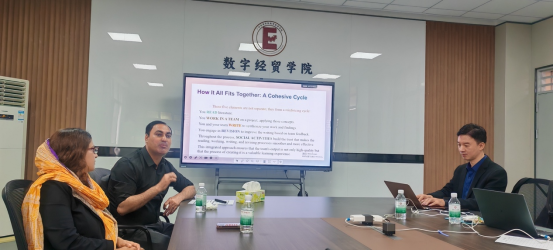 他系统梳理了相关理论从旧到新的发展脉络,并重点讲解了研究方法论。Dr.Arshad Khan分享了在实际操作中如何运用方便抽样(Convenience Sampling)进行数据收集,并现场讲解了如何使用SmartPLS工具进行结构方程模型分析输出结果,以及深入浅出地解析了数据分析结果的判断条件与解读标准,为在座教师提供了宝贵的实操经验。Dr. Arshad Khan 演示的 SmartPLS 数据分析工具及严谨的量化研究逻辑,为系部优化商务大数据分析与应用等数据分析相关的核心课程的教学设计提供了国际化的实操范本。