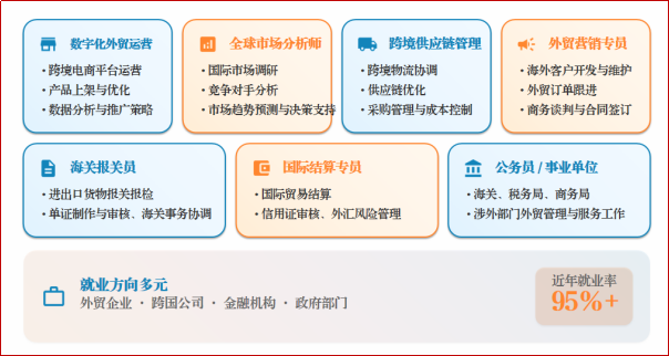 【专业核心课程】:国际贸易、国际市场营销学、国际商法、国际贸易实务、国际服务贸易、跨境电子商务、国际结算等