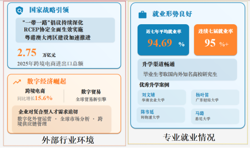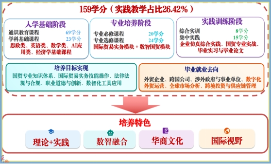 本专业培养德智体美劳全面发展,适应国家高水平对外开放与数字经济深度融合的战略需求,粤港澳“大湾区”,服务于国家“一带一路”等经济发展战略,系统掌握国际经济与贸易的基本理论、数字贸易的核心方法及智能数据分析工具,具备运用数智化技术解决复杂国际经贸问题的实践能力与跨文化沟通能力,拥有多学科交叉知识背景,兼具深厚家国情怀与国际化视野自觉弘扬华商文化中“守信、敢为、创新”的优秀品格,能在外贸企业、跨国公司及涉外政府与事业单位,胜任数字化外贸运营、全球市场分析与决策、跨境投资与供应链管理等工作的高素质、复合型、创新型、应用型数字时代经贸人才。