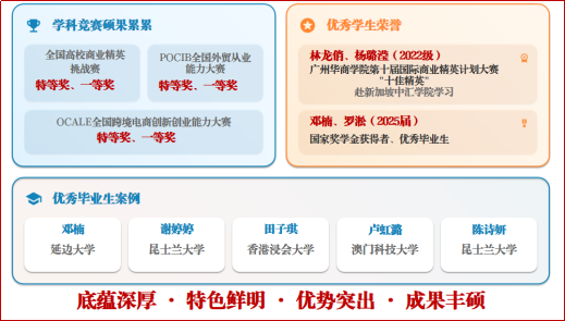 作为广州华商学院建校之初的奠基石,国际经济与贸易专业赓续“始有华商,即有经贸”的历史荣光,以其设立早、积淀久、基础牢的深厚底蕴,铸就了不可替代的专业优势。本专业立足粤港澳大湾区,抢占数字经济发展先机,将厚重的历史积淀转化为鲜明的办学特色,通过无缝对接产业需求、深度重构教育实践,打造出数智化时代具有国际视野的复合型应用型高素质人才摇篮,彰显了“底蕴深厚、特色鲜明、优势突出”的专业实力。