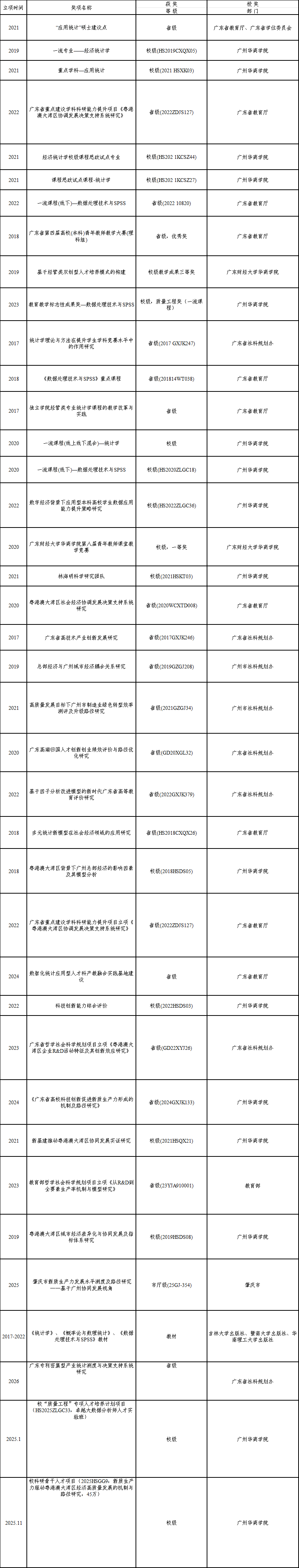 本专业现有专任教师21名,其中博士5名、硕士16名,硕博占比100%,教授、副教授7名,高级职称占比33.33%,其中,二级教授2人,享受国务院特殊津贴1人,广东省人民政府参事1人,南粤优秀教师1人,广东民办学校优秀教师2人,专任教师中多人获得过国家统计局“优秀统计教师奖”“青年教师课堂教学竞赛一等奖”“教师教学创新大赛一等奖”“优秀共产党员”等多项荣誉称号。本专业大多数教师毕业于国内知名的985、211等院校的统计学专业或与统计学专业相近的专业,已建成一支学历、职称、年龄与学缘结构合理、教学水平高、师德师风高尚的优秀教学团队。