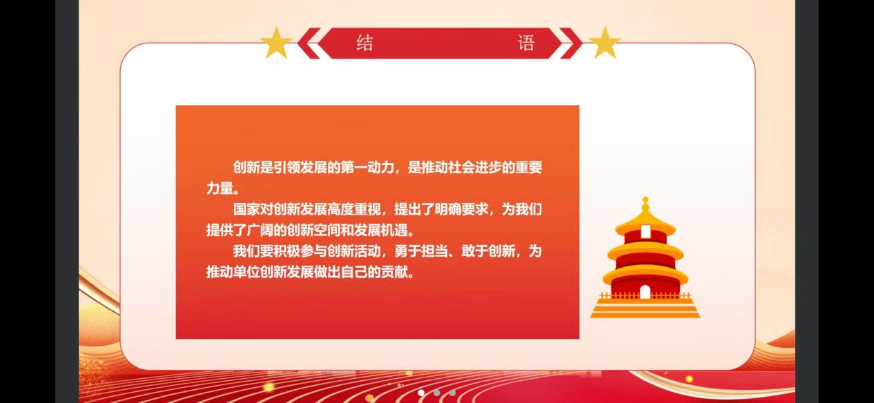 、发挥先锋模范作用、推动创新成果转化、勇于担当创新责任。创新是引领发展的第一动力,是推动社会进步的重要力量。国家对创新发展高度重视,提出了明确要求,为我们提供了广阔的创新空间和发展机遇。我们要积极参与创新活动,勇于担当、敢于创新,为推动单位创新发展做出自己的贡献。