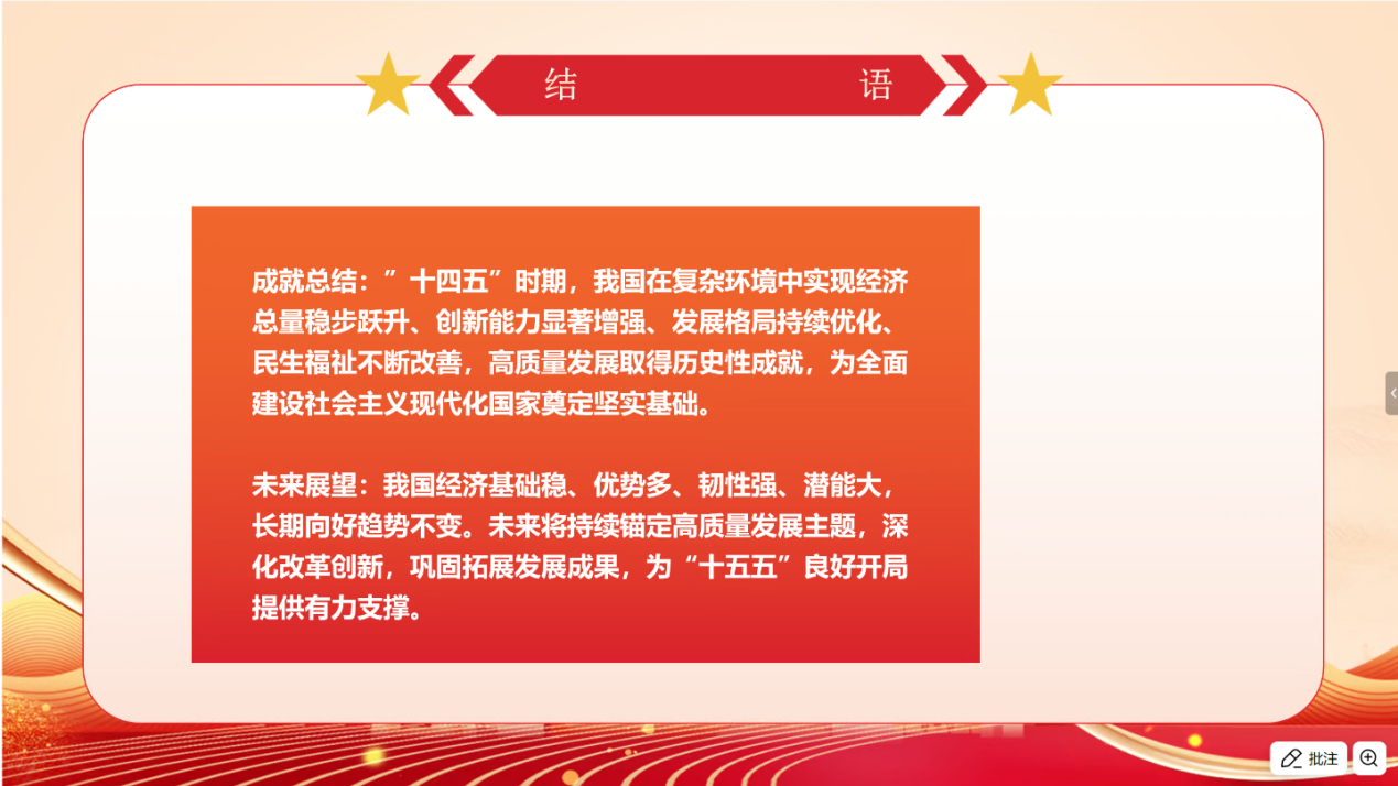 总结与展望:汇总 “十四五” 成就,分析发展优势,明确未来高质量发展方向,组织成员交流感悟。