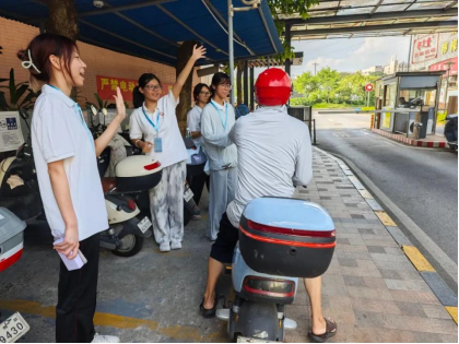 经贸e起奋进队在指导老师的带领下,组织开展新世界社区出入口定点提醒居民出行佩戴头盔活动,以实际行动为居民普及电动车骑行安全知识,提升居民们电动车骑行安全意识,增强防范安全事故发生的能力。