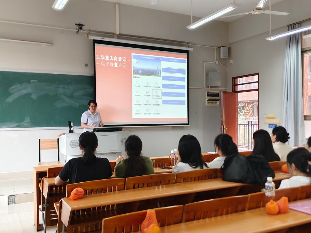 会上,辅导员刘甜玲老师针对毕业关键事项展开讲解。在毕业去向登记与电子就业协议方面,通过PPT分步演示,让同学们清晰掌握操作流程,避免因疏漏产生问题。对于就业协议条款解读,老师运用通俗易懂的话语跟同学们讲解,确保同学们了解自身权益与责任,为求职签约筑牢认知基础。同时,针对同学们在毕业答辩、就职过程中所面临的各种挑战,我们特别组织一些现场指导活动,旨在帮助大家有效应对心理压力、确保个人安全以及解决生活中的各种实际问题。在这些活动中,我们不仅提供了心理辅导,帮助同学们缓解紧张情绪,还分享了实用的安全知识,以增强大家的自我保护意识。