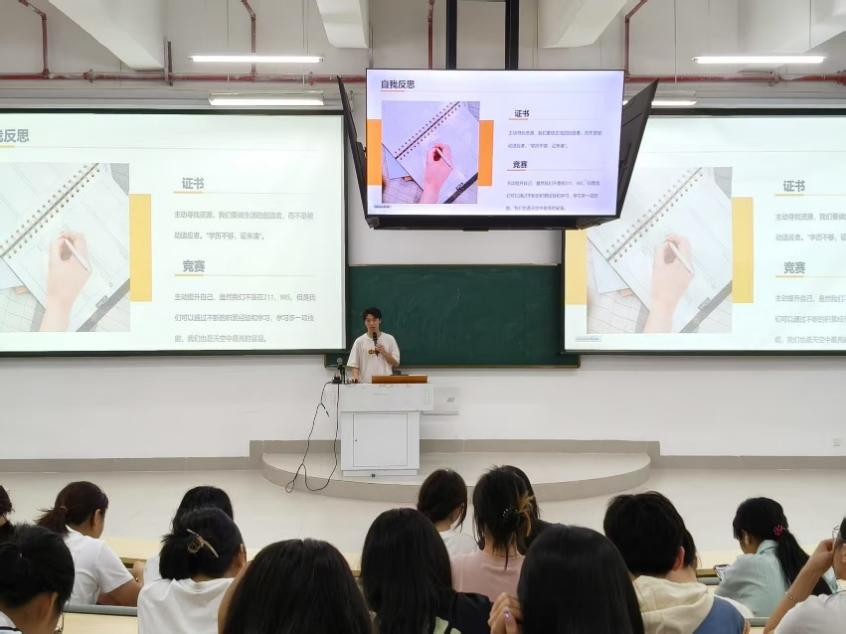 在学习经验方面,陈嘉宏同学结合自己大一的经历,分享了丰富多样的学习路径。他积极参与学院组织的各类活动,在实践中锻炼自己的综合能力;投身学科竞赛,凭借努力在三创赛、OCALE竞赛、泰迪杯等比赛中斩获佳绩;踊跃参加校内外志愿活动和暑期三下乡活动,积累社会经验。他还详细介绍了大学期间各类重要证书的报考信息,包括计算机二级、英语四六级、初级会计以及自身专业证书等,提醒同学们合理规划考证时间,为未来的职业发展增添筹码。