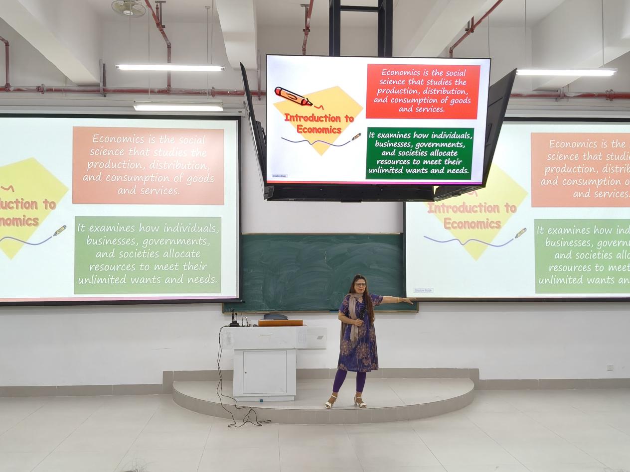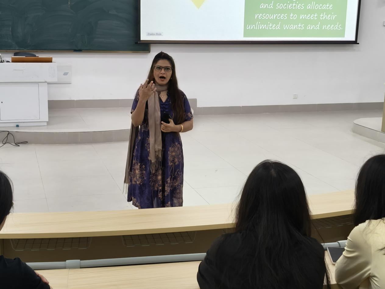 讲座开始, Aneela博士先是引入经济学导论,指出经济学是研究商品和服务的生产、分配和消费的社会科学,研究个人、企业、政府和社会如何来分配资源以及满足其需求和愿望。