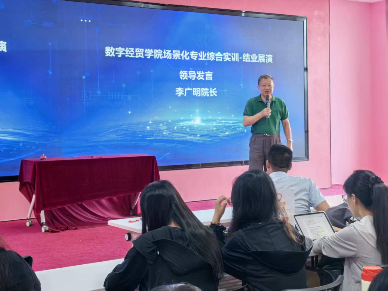 在结营仪式上,广州华商学院数字经贸学院李广明院长发表了热情洋溢的致辞。他首先向所有参与工作坊的同学表示了热烈的祝贺。他充分肯定了本次实训取得的成果,并鼓励师生们积极拥抱数字时代的快速变化,勇于创新,将所学知识转化为解决实际问题的实践能力,为数字贸易产业的繁荣发展贡献自己的智慧与力量。 他特别勉励同学们:“要珍惜这次难得的学习与实践机会,它不仅是你们简历上的一笔,更是你们职业能力的一次淬炼。希望你们能将实训中的收获内化为自身的核心竞争力,未来在广阔的数字化舞台上大展宏图。