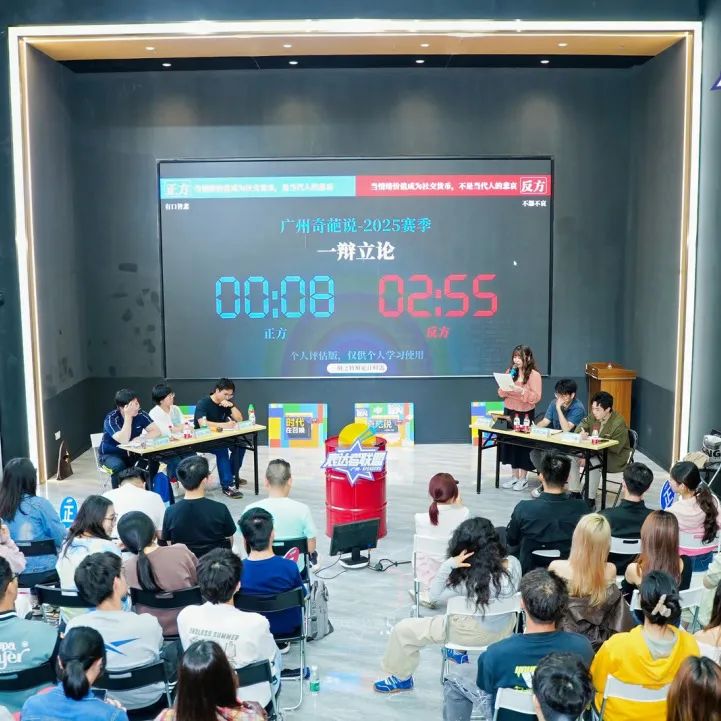当日下午,师生们转场至番禺大学城,观摩了一场精彩纷呈的【奇葩说】线下比赛。作为2025赛季个人赛的第二场,这场比赛延续了奇葩说线下赛一贯的高水准和热烈氛围。