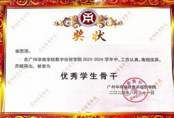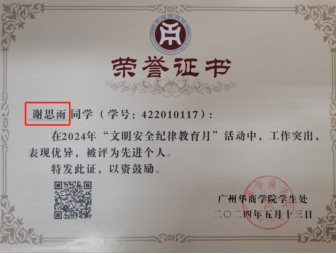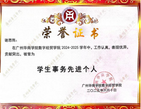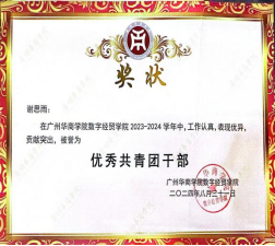 在学生工作方面,谢思雨同志身兼数职,曾任数字经贸学院团委学生兼职副书记、23级国际经济与贸易班助班、团学组织部负责人,现任22国际经济与贸易班团支书。她认真负责,积极组织各类校园活动,从新生入学教育到团生活动策划,都能看到她忙碌的身影。担任团支书期间,她创新班级管理模式,开展形式多样的主题活动,增强班级凝聚力。她个人也连续两年2024年、2025年5月被评为广州华商学院“优秀团支书”。此外,她还热心志愿服务,积极参与校内外各项志愿活动,做到以奉献传递温暖。
