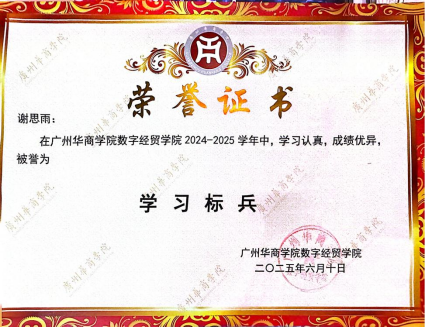 作为一名中共党员,谢思雨同志始终坚守初心使命。她积极利用“学习强国”等平台,深入学习党的理论知识,不断提高自身政治素养。在担任数字经贸学院学生第一党支部副书记期间,她精心组织各类党建活动,如红色主题参观活动、志愿活动等,激发支部成员的学习热情,增强党组织的凝聚力和战斗力。凭借出色表现,她多次荣获广州华商学院“文明安全纪律教育月”先进个人称号,并荣获2025年广州华商学院“优秀共产党员”称号,以实际行动彰显党员的先锋模范作用。