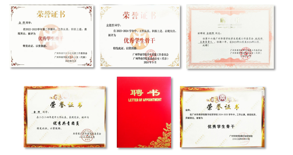 她始终以“服务者”与“践行者”双重身份投身学生工作,担任过3项学生干部职责,尽显统筹策划与执行能力。作为校学生党建工作委员会统战部主要负责人,组织策划15+大型校级活动,覆盖2000余人次,包括组织策划肇庆校区“党史知识竞赛”、四期“党员先锋”宣讲团活动、五期“红色观影”系列活动及党工委第十六届素质拓展等校级项目。牵头组织10余场工作会议,构建“策划—督导—复盘”标准化体系,推动党建活动规范化。因工作成效显著,连续两年获评“优秀学生骨干”,并获2024年五四优秀共青团员、数字经贸学院优秀学生骨干等荣誉,以实际行动诠释“以奉献担责、以实践成长”的青年担当。